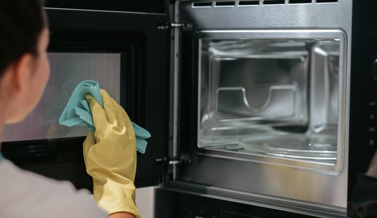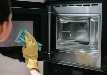 Exterior and interior appliances cleaned and sanitized: refrigerator/dishwasher, range hood, and microwave
